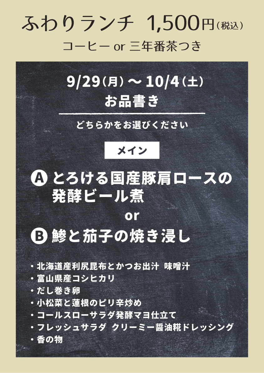 【ふわり週替わりランチ】9/29(月)~10/4(土)