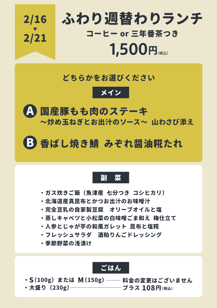 【ふわり週替わりランチ】2/16(月)~2/21(土)