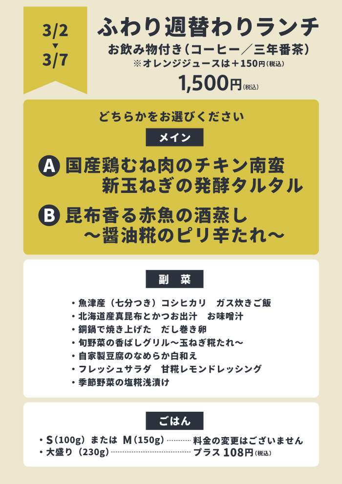 【ふわり週替わりランチ】3/2(月)~3/7(土)