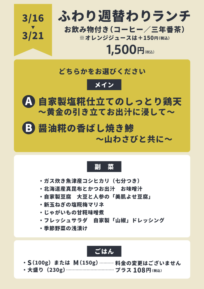 【ふわり週替わりランチ】3/16(月)~3/21(土)