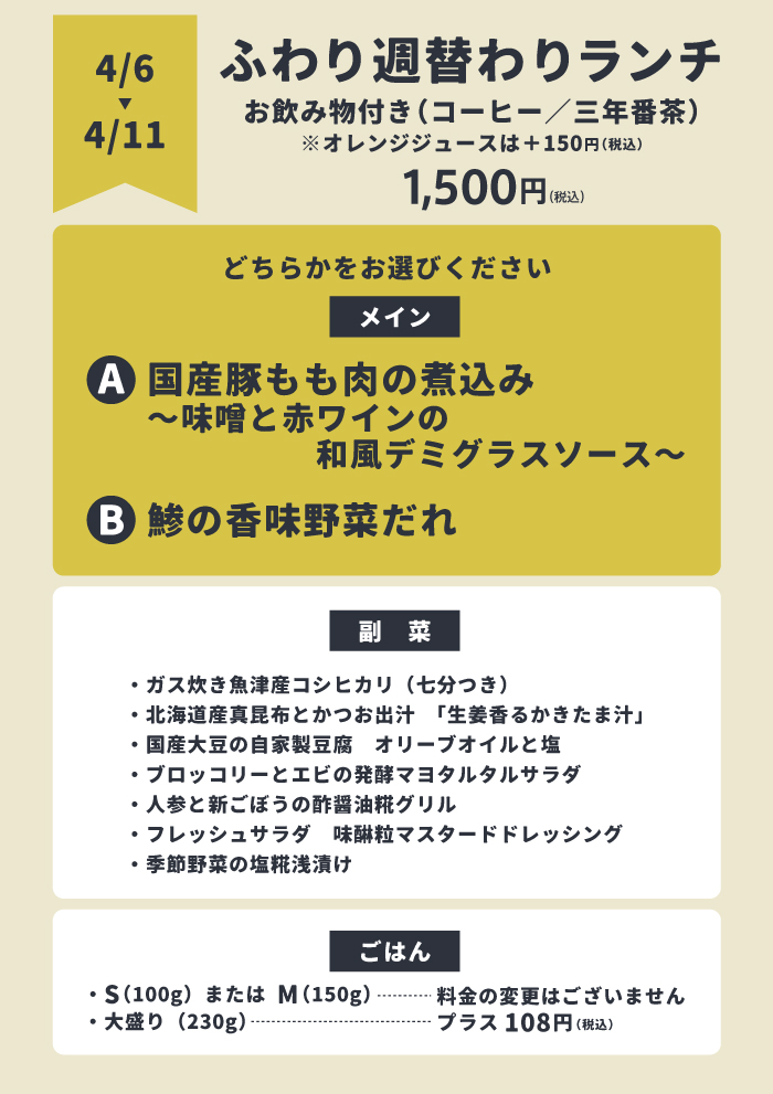【ふわり週替わりランチ】4/6(月)~4/11(土)