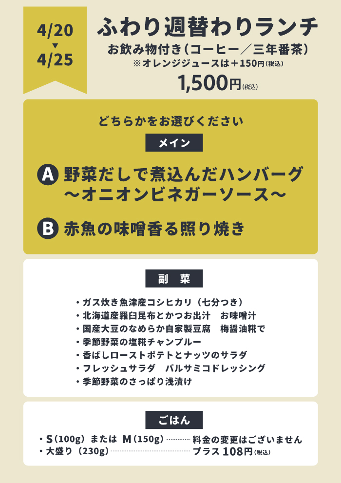 【ふわり週替わりランチ】4/20(月)~4/25(土)