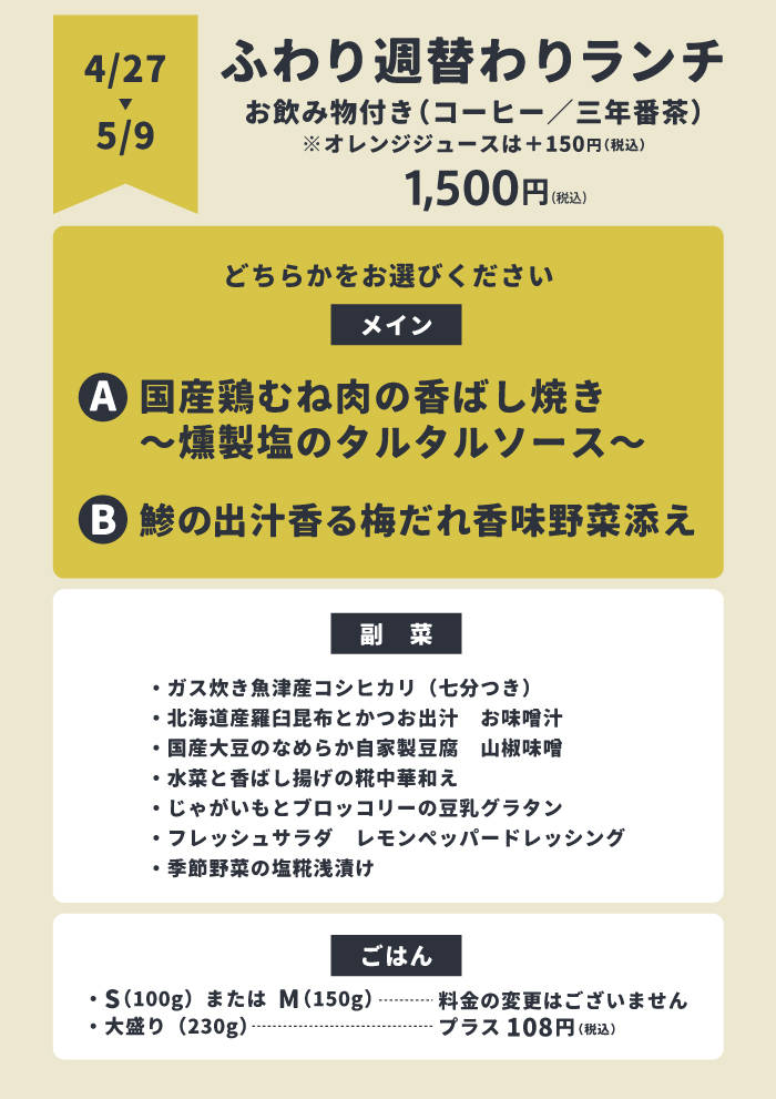【ふわり週替わりランチ】4/27(月)~5/9(土)